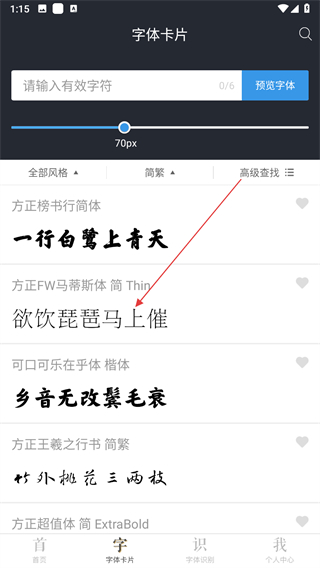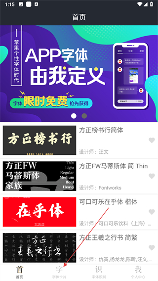 2、在字體卡片頁(yè)面,滑動(dòng)下方的字體列表,挑選心儀的字體樣式。