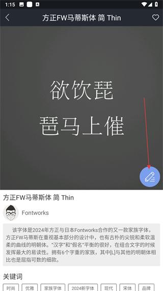 3、選中喜歡的字體后,點(diǎn)擊進(jìn)入該字體詳情頁(yè)面,然后點(diǎn)擊頁(yè)面右側(cè)的編輯圖標(biāo)。