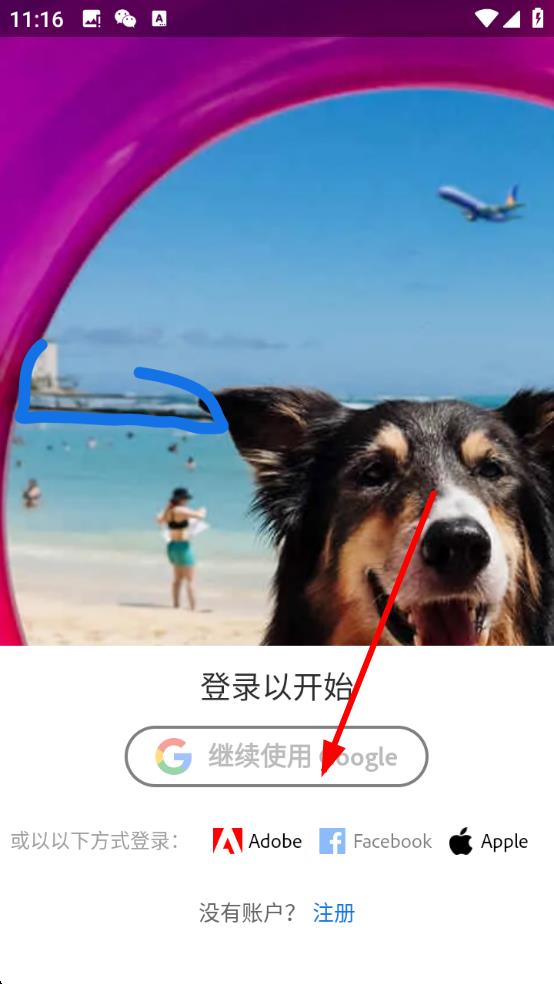 1、打開APP,在登錄頁選繼續(xù)使用Google或Adobe、Facebook、Apple等方式登錄,無賬戶可點注冊。