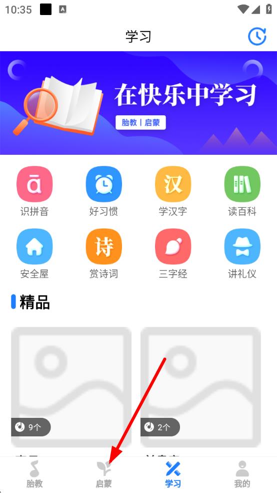 1、打開(kāi)胎教啟蒙軟件,點(diǎn)擊底部導(dǎo)航欄中的啟蒙按鈕,進(jìn)入啟蒙板塊。