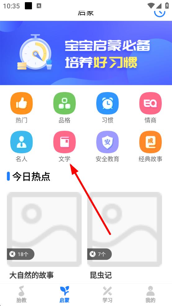 2、在啟蒙板塊里,有熱門(mén)、品格、文學(xué)等多個(gè)分類(lèi),點(diǎn)擊文學(xué)選項(xiàng),進(jìn)入文學(xué)分類(lèi)頁(yè)面。