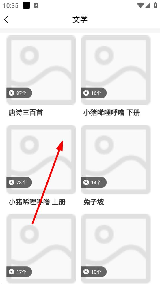 3、在文學(xué)分類(lèi)頁(yè)面中,能看到唐詩(shī)三百首、小豬唏哩呼嚕等內(nèi)容,點(diǎn)擊唐詩(shī)三百首,即可選擇相應(yīng)內(nèi)容進(jìn)行播放,給寶寶進(jìn)行文學(xué)啟蒙。