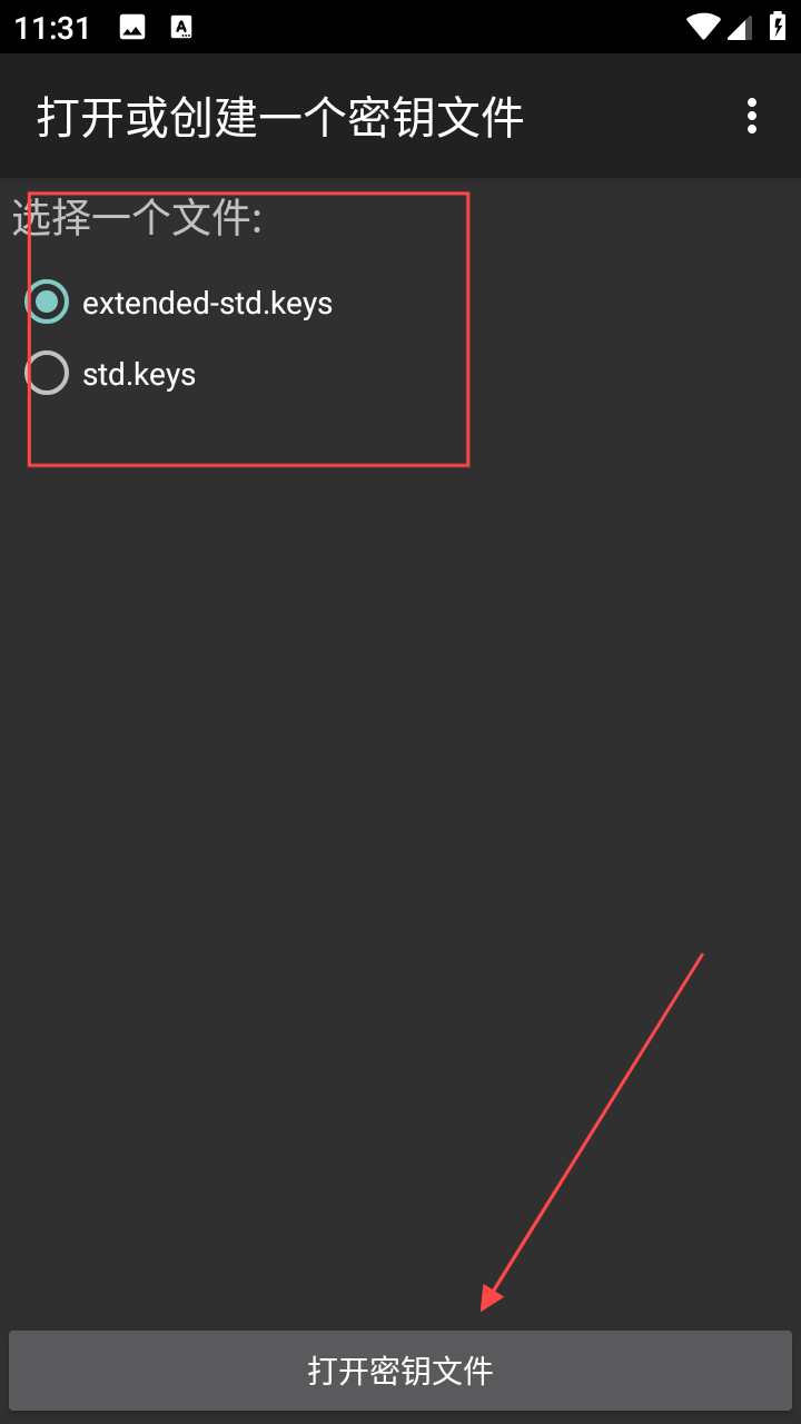 2、進(jìn)入打開(kāi)或創(chuàng)建密鑰文件頁(yè)面,選擇一個(gè)已有的密鑰文件,然后點(diǎn)擊打開(kāi)密鑰文件,進(jìn)入密鑰編輯器頁(yè)面即可。