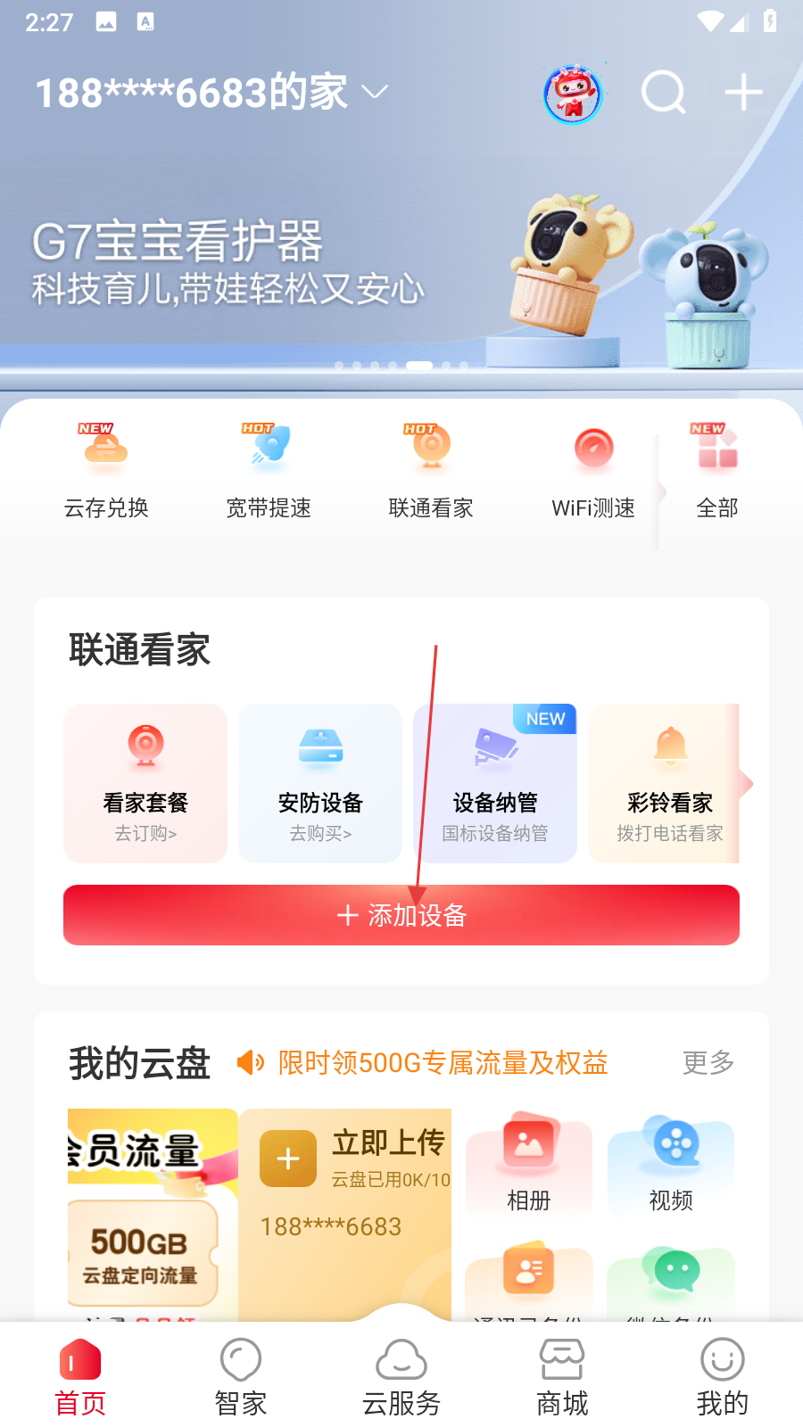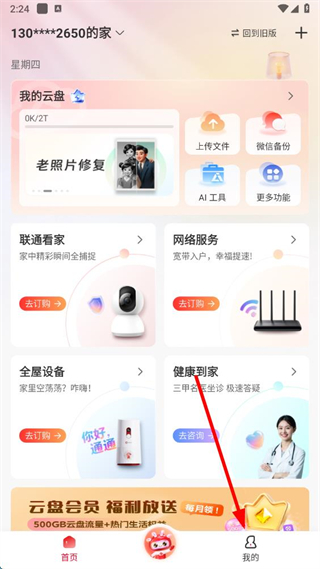 1、在聯(lián)通智家app首頁(yè),點(diǎn)擊右下角我的選項(xiàng),進(jìn)入個(gè)人中心頁(yè)面。