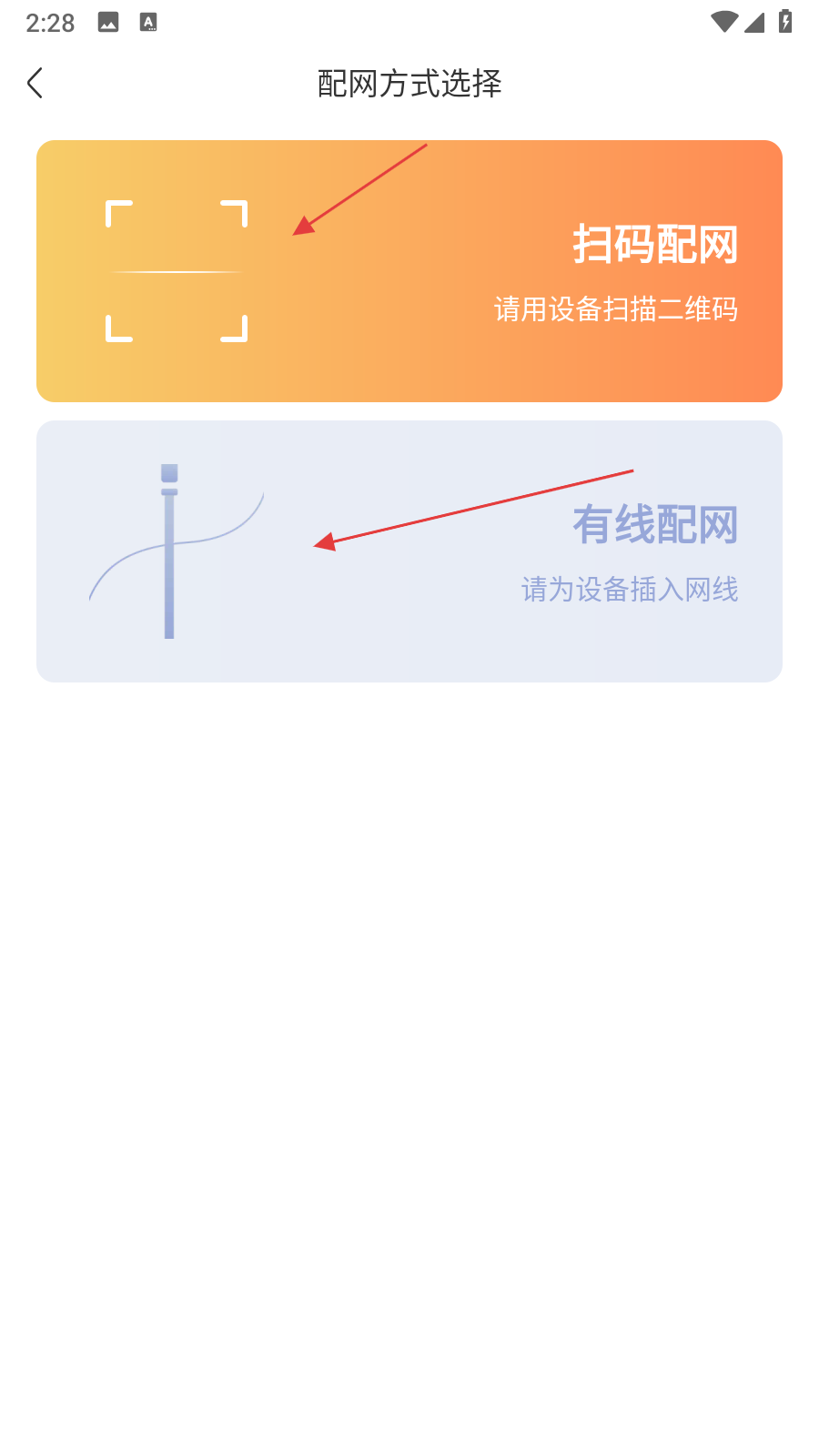 3、進(jìn)入配網(wǎng)方式選擇頁(yè)面后,選擇掃碼配網(wǎng)或有線配網(wǎng),按提示完成設(shè)備配網(wǎng),即可成功添加設(shè)備。