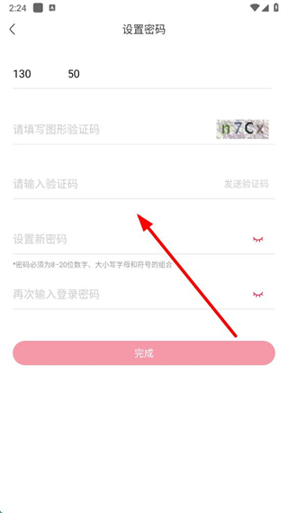 4、在設(shè)置密碼頁(yè)面,依次填寫驗(yàn)證碼,設(shè)置新密碼,點(diǎn)擊完成即可修改密碼。