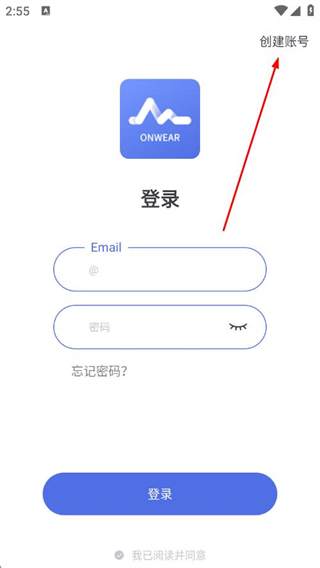 1、打開(kāi)OnWear APP,在登錄頁(yè)面點(diǎn)擊右上角創(chuàng)建賬號(hào),進(jìn)入賬號(hào)創(chuàng)建頁(yè)面。