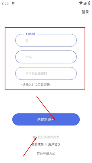 2、在賬號(hào)創(chuàng)建頁(yè)面輸入Email、密碼并再次確認(rèn)新密碼,勾選后點(diǎn)擊創(chuàng)建新賬號(hào)。