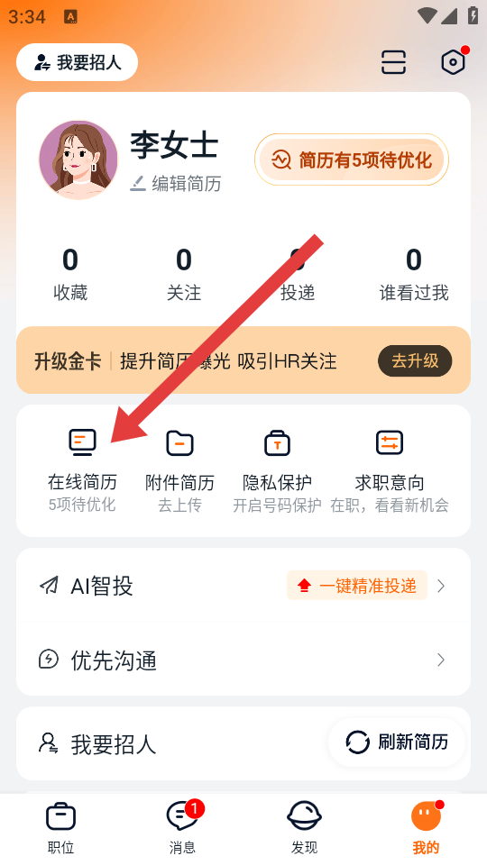 1、打開獵聘APP,進(jìn)入我的頁(yè)面,點(diǎn)擊個(gè)人信息下方的編輯簡(jiǎn)歷,進(jìn)入中文簡(jiǎn)歷編輯界面。