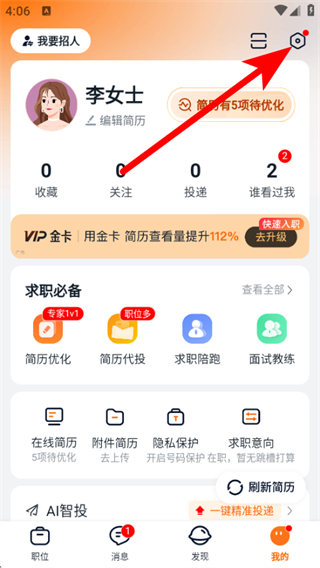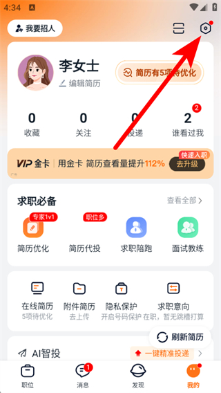2、在個(gè)人頁(yè)面中,點(diǎn)擊右上角的設(shè)置圖標(biāo),進(jìn)入設(shè)置頁(yè)面。