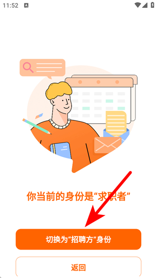 3、彈出身份提示頁(yè)面后,點(diǎn)擊切換為招聘方身份按鈕,即可完成身份切換。