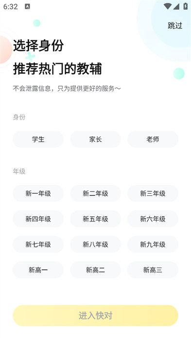 1、可以選擇自己的身份和年級之后進入軟件,這樣會智能的為用戶們進行推薦;