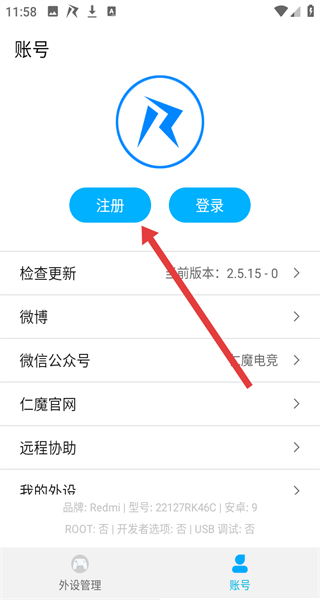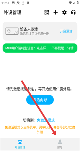 1、在外設(shè)管理頁面點(diǎn)擊右下角“賬號(hào)”,進(jìn)入賬號(hào)頁面。