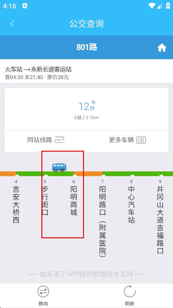 3、進(jìn)入公交詳情頁(yè)面后,可查看該線路的首末班時(shí)間、票價(jià)以及途經(jīng)站點(diǎn)等信息,還能看到車輛的實(shí)時(shí)位置等情況,方便了解公交的運(yùn)營(yíng)狀態(tài)。