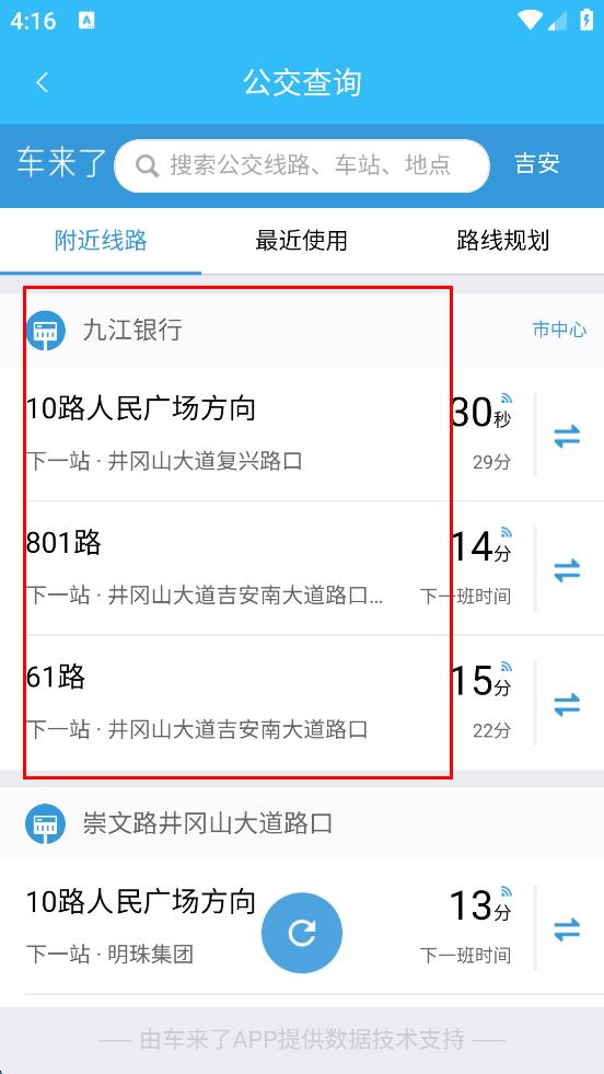 1、打開吉安公交服務(wù)軟件,在首頁(yè)功能選項(xiàng)中找到“公交查詢”選項(xiàng)并點(diǎn)擊,進(jìn)入公交查詢頁(yè)面,可看到附近線路、最近使用等標(biāo)簽。