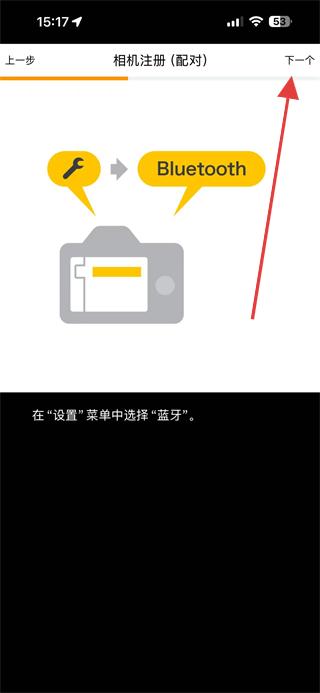 3.在相機(jī)的設(shè)置菜單中選擇藍(lán)牙選項(xiàng),繼續(xù)點(diǎn)擊下一個(gè)。