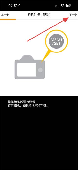 2.按照提示,操作相機(jī)按下MENU/SET鍵,然后點(diǎn)擊界面右上角的下一個(gè)。