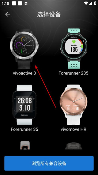 2、在設(shè)備選擇頁(yè)面中,挑選對(duì)應(yīng)的佳明手表型號(hào),進(jìn)入配對(duì)頁(yè)面。