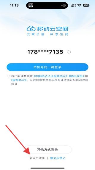 1、打開移動云空間APP,點擊下方新用戶注冊的按鈕。