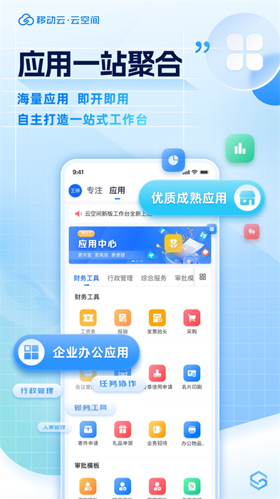 移動云云空間是基于移動云強大的云端數據管理能力,以企業(yè)協(xié)作管理場景為入口,聚合海量應用,助力企業(yè)快速構建信息化支撐體系,面向全行業(yè)用戶提供的企業(yè)應用聚合平臺。