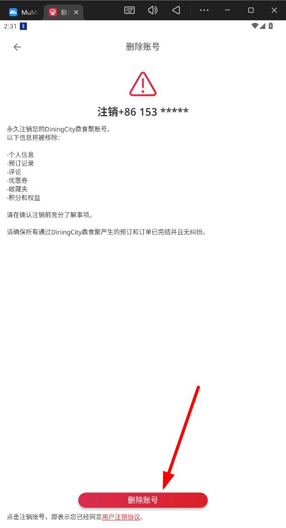 4、在刪除賬號頁面,仔細閱讀相關提示信息,確認后點擊下方的刪除賬號按鈕,按照提示完成注銷操作。