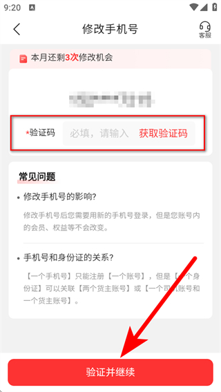 4、在修改手機(jī)號頁面,輸入驗證碼后點擊驗證并繼續(xù),按照提示完成操作。