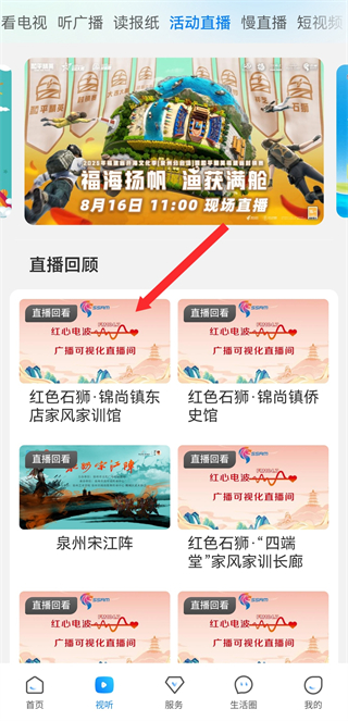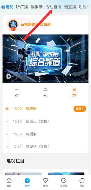 2、在視聽的頁(yè)面,點(diǎn)擊頂部的活動(dòng)直播,進(jìn)入活動(dòng)直播頁(yè)面。