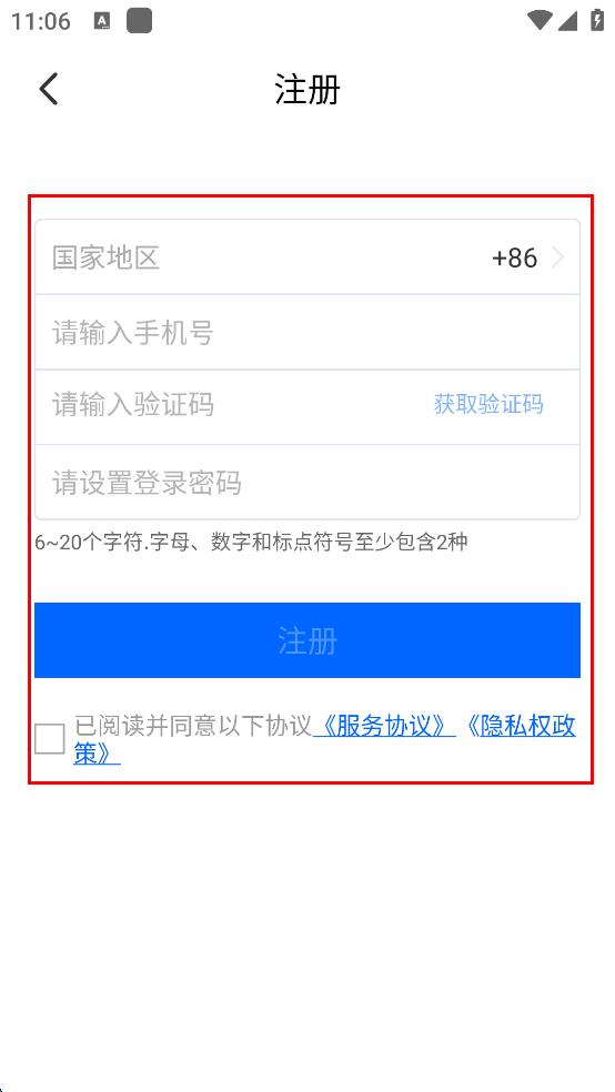 4、閱讀完注冊(cè)協(xié)議后,進(jìn)入注冊(cè)信息填寫頁(yè)面,選擇國(guó)家地區(qū),輸入手機(jī)號(hào)碼,點(diǎn)擊“獲取驗(yàn)證碼”并輸入,然后設(shè)置登錄密碼。