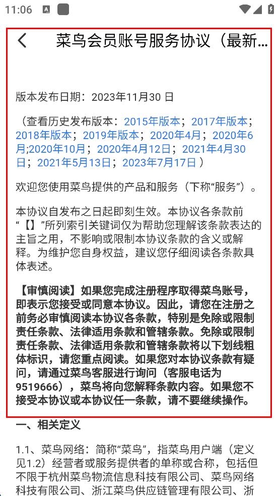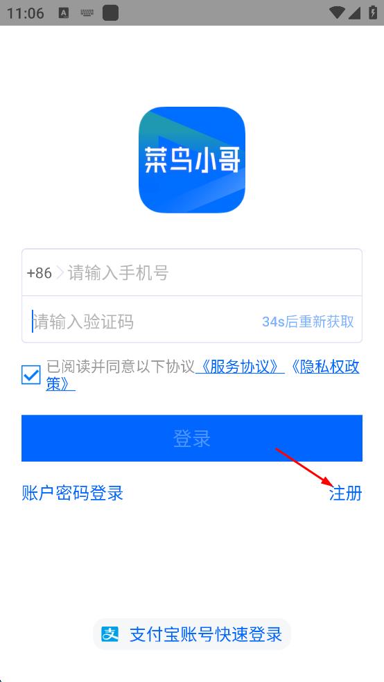 2、在登錄界面,點(diǎn)擊“注冊(cè)”選項(xiàng),進(jìn)入注冊(cè)協(xié)議查看頁(yè)面,認(rèn)真閱讀菜鳥會(huì)員賬號(hào)服務(wù)協(xié)議。