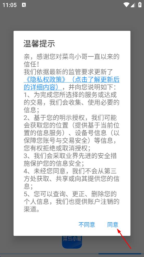 1、打開菜鳥小哥APP,在彈出的溫馨提示框中,仔細(xì)閱讀相關(guān)內(nèi)容后,點(diǎn)擊“同意”,進(jìn)入登錄界面。