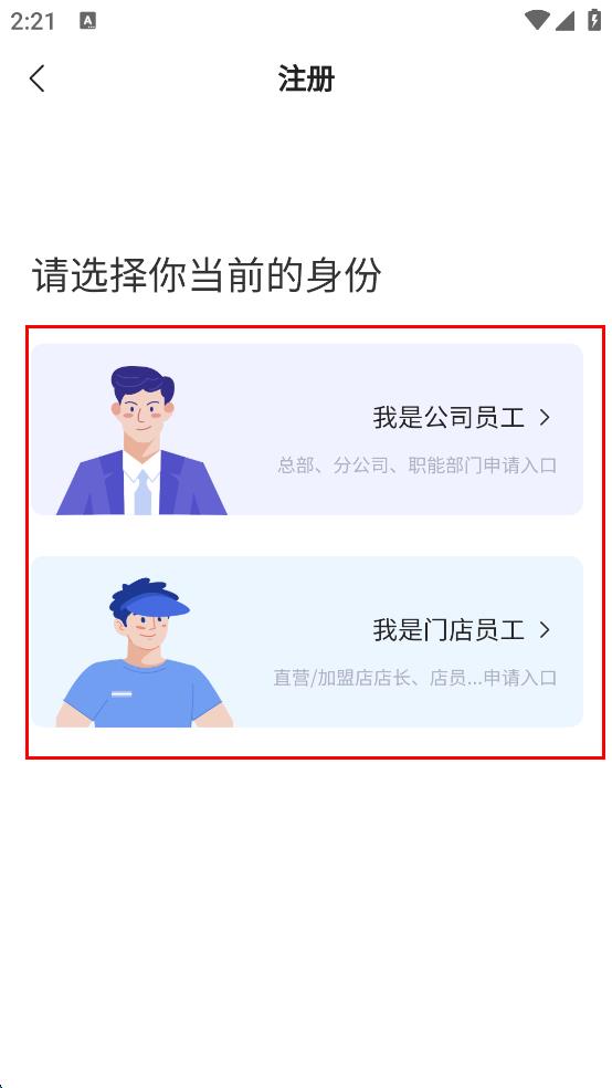 2、進(jìn)入注冊(cè)頁(yè)面,在請(qǐng)選擇你當(dāng)前的身份選項(xiàng)中,根據(jù)自身情況選擇我是公司員工或我是門店員工。