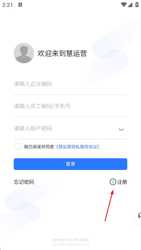 4、輸入完成后,勾選我已閱讀并同意慧運(yùn)營(yíng)隱私服務(wù)協(xié)議復(fù)選框,最后點(diǎn)擊注冊(cè)按鈕,即可完成慧運(yùn)營(yíng)APP的注冊(cè)操作。