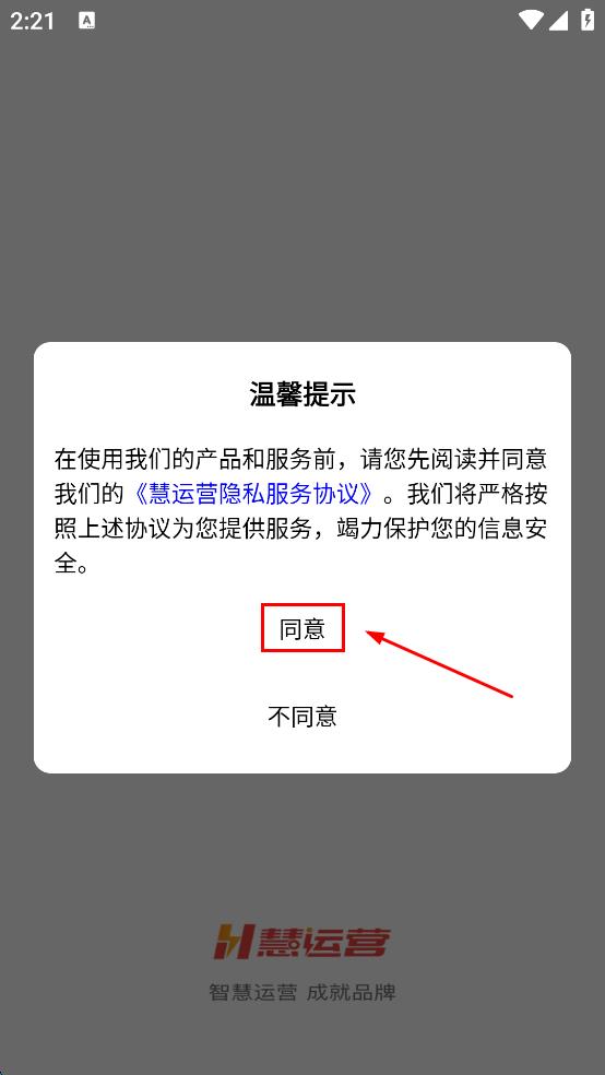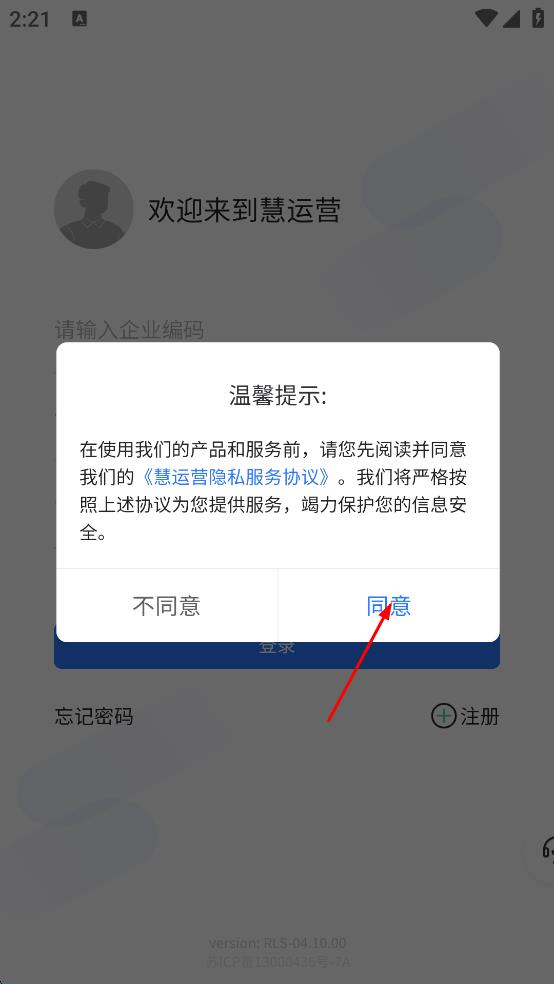 1、打開(kāi)慧運(yùn)營(yíng)APP,在彈出的溫馨提示頁(yè)面,點(diǎn)擊同意,進(jìn)入登錄界面后,點(diǎn)擊注冊(cè)。