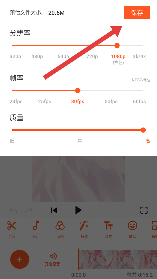 4、在保存設置界面,調整分辨率等參數(shù)后,再次點擊保存,即可完成視頻剪輯。