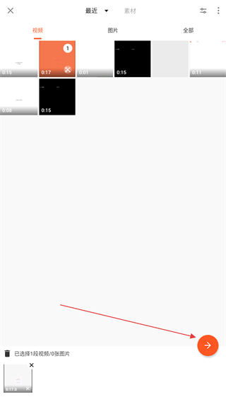 2、在素材選擇界面選取目標視頻素材,點擊右下角進入視頻編輯界面。