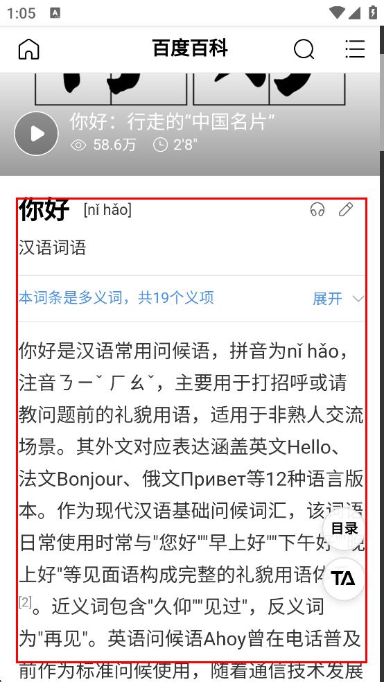 3、進(jìn)入百度百科頁面后,查看你好的拼音、釋義等基本信息。