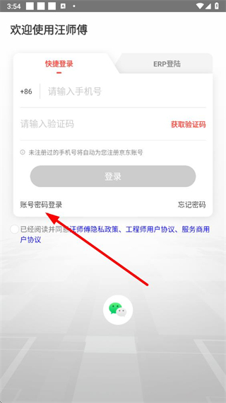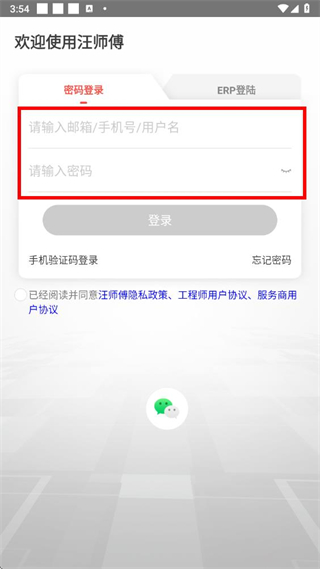 1、在汪師傅app登錄頁(yè)面點(diǎn)擊賬號(hào)密碼登錄選項(xiàng),進(jìn)入密碼登錄頁(yè)面。