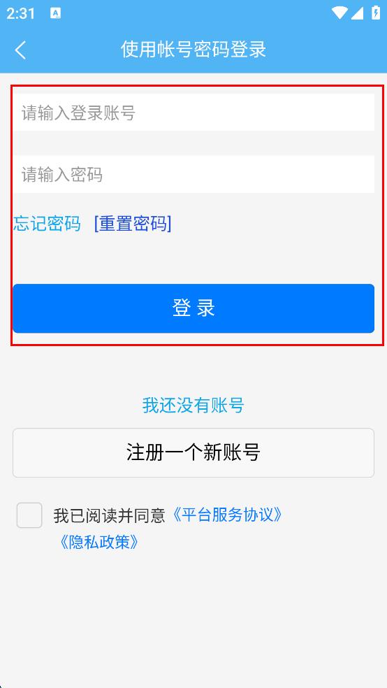 4、在使用帳號(hào)密碼登錄界面,輸入登錄賬號(hào)和密碼,勾選我已閱讀并同意協(xié)議,隱私政策,點(diǎn)擊“登錄”按鈕。