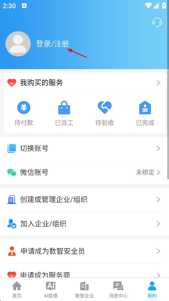 3、在“我的”頁(yè)面,點(diǎn)擊“登錄/注冊(cè)”選項(xiàng),進(jìn)入使用帳號(hào)密碼登錄界面。