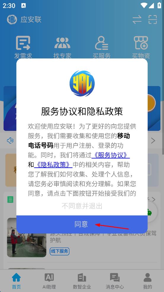 1、打開(kāi)應(yīng)安聯(lián)APP,出現(xiàn)服務(wù)協(xié)議和隱私政策頁(yè)面,仔細(xì)查看后點(diǎn)擊“同意”按鈕。
