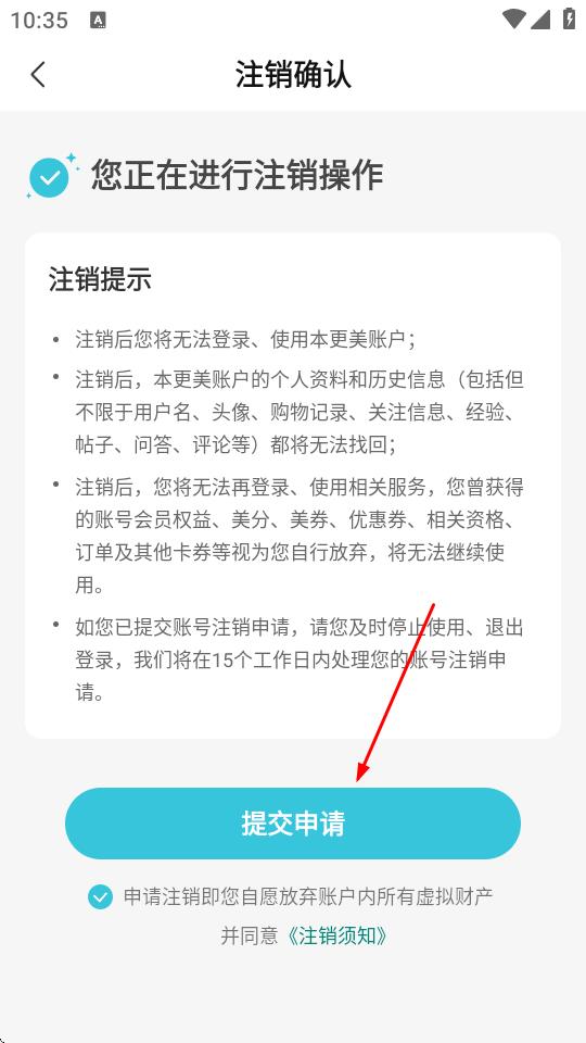 4、進(jìn)入注銷確認(rèn)頁(yè)面,點(diǎn)擊提交申請(qǐng),默認(rèn)勾選同意注銷須知。