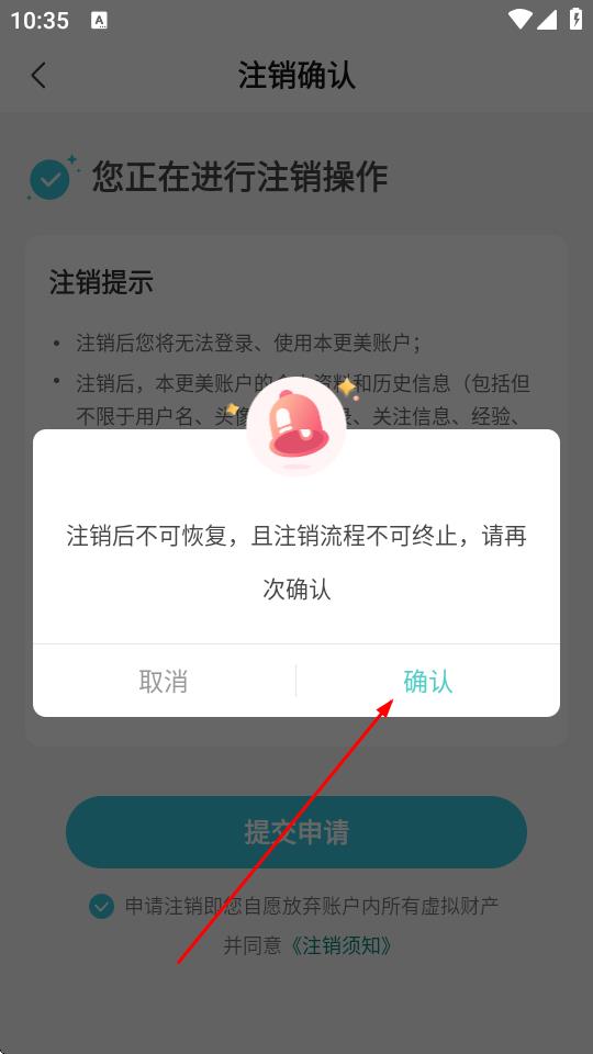 5、在彈出的再次確認(rèn)彈窗中,點(diǎn)擊確認(rèn),即可提交賬號(hào)注銷申。