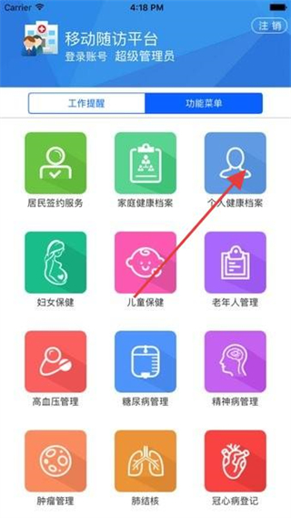 2、在功能菜單頁(yè)面點(diǎn)擊個(gè)人健康檔案選項(xiàng)。