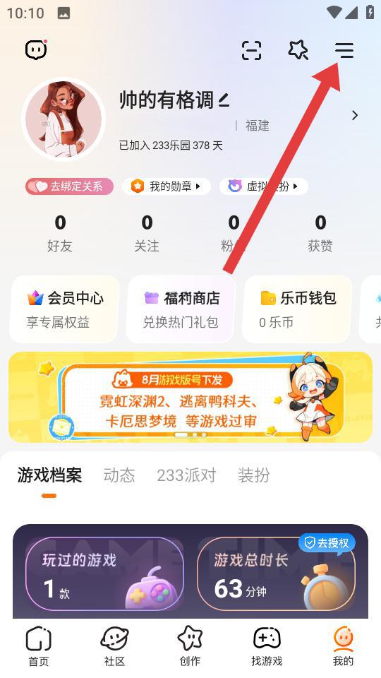 1、進(jìn)入233樂園我的的頁(yè)面后,點(diǎn)擊右上角三條橫線的菜單圖標(biāo),展開系統(tǒng)功能列表。