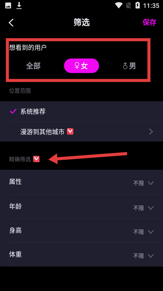 3、在篩選設(shè)置頁(yè)面中,可以先選擇想看到的用戶(hù)類(lèi)別,若需要更精準(zhǔn)篩選,可點(diǎn)擊開(kāi)啟精確篩選,對(duì)條件進(jìn)行設(shè)置,即可按照設(shè)定條件篩選出符合要求的用戶(hù)。
