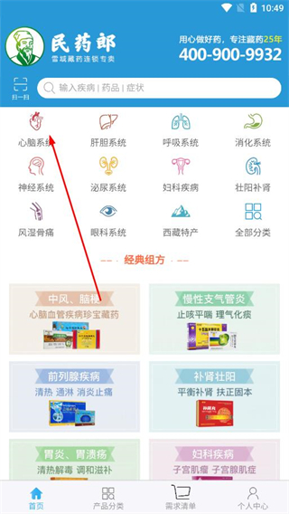 1、打開(kāi)民藥郎APP,在首頁(yè)選擇疾病分類,如心腦系統(tǒng)。