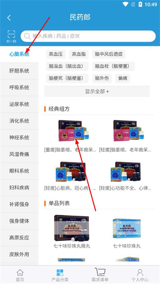 2、在疾病分類頁(yè)面,選擇對(duì)應(yīng)的經(jīng)典組方或單品。