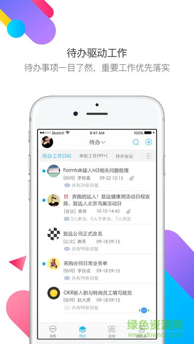 25類(lèi)審批操作:加簽/會(huì)簽/指定回退/核定等;10類(lèi)審批應(yīng)用:用車(chē)審批、新聞審批、會(huì)議室審批等均可利用碎片化時(shí)間快速移動(dòng)審批。