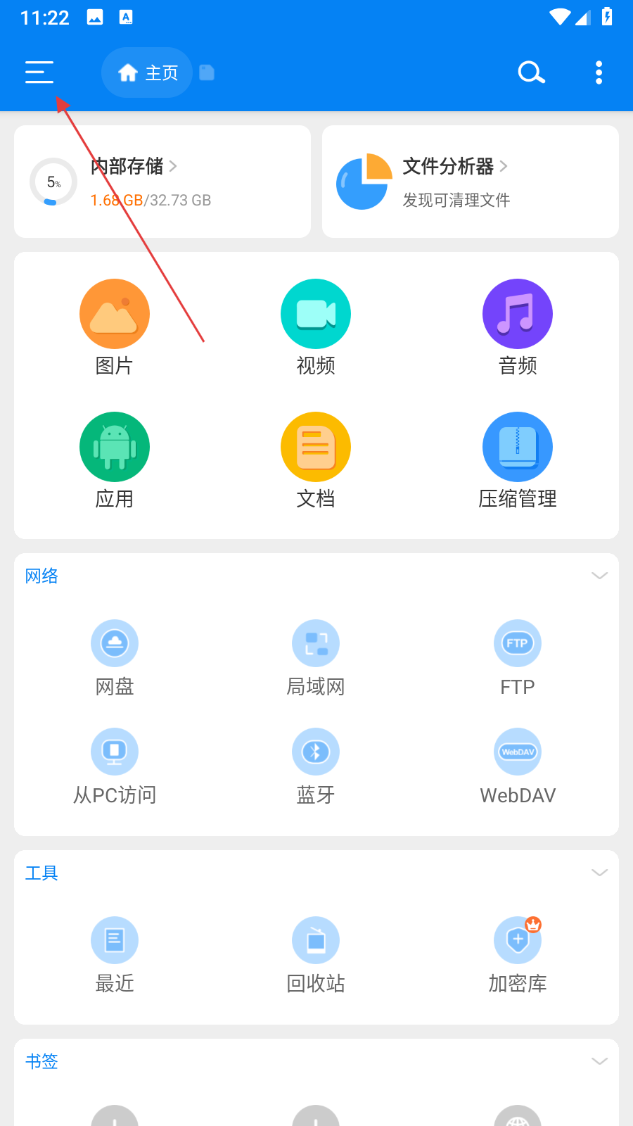 -- 下載并打開rs文件管理器軟件,在主頁中能夠看到網(wǎng)盤、局域網(wǎng)、ftp等多種功能