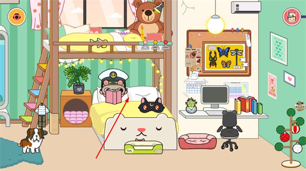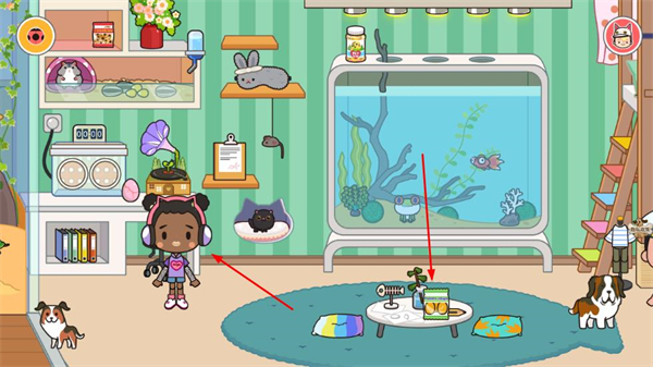 2、在場景內(nèi)與各種物品互動(dòng),如給寵物喂食、和角色玩耍,探索場景中的元素。